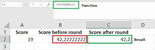 For example, when computing the test scores of students, we may want to ensure that the final score does not exceed a single decimal point as the end result. In the following example we use the ROUND function on data cell B2 and return the result as a rounded number by 1 decimal point in data cell C2. Note that the ROUND function requires two parameters, the number to be rounded (B2) and the amount of decimal points we want the number to be rounded to (1). These parameters are separated by a semi-colon (;).