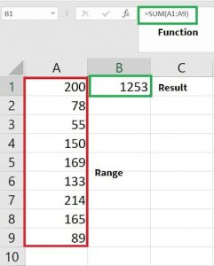 SUM – The SUM function allows us to perform the addition operation but on a somewhat larger scale that targets a range of numbers instead of just two numbers. This is particularly useful if we want the sum of hundreds or even thousands of data cells without having to manually compute the value with the use of a formula. For example, if we would like to calculate the total value of sales for a given month, we can opt for the SUM function. In the following example the result for a given range when using the SUM function is equal to 1253.