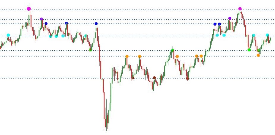 In the diagram, you will see horizontal lines spanning across the chart; these lines are identifying the important key levels spoken about, and on each horizontal line you will see a dot which pinpoints exactly where the price reaction to the key level is occurring. You will notice that each key horizontal has a specific pinpoint dot colour to help guide your eye through the multiple examples that are scattered across the chart.